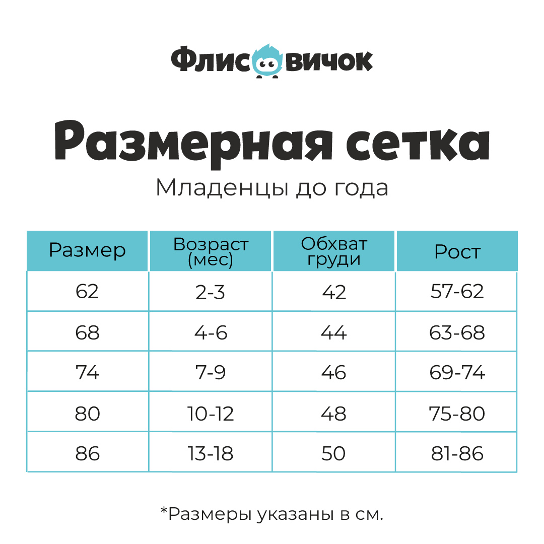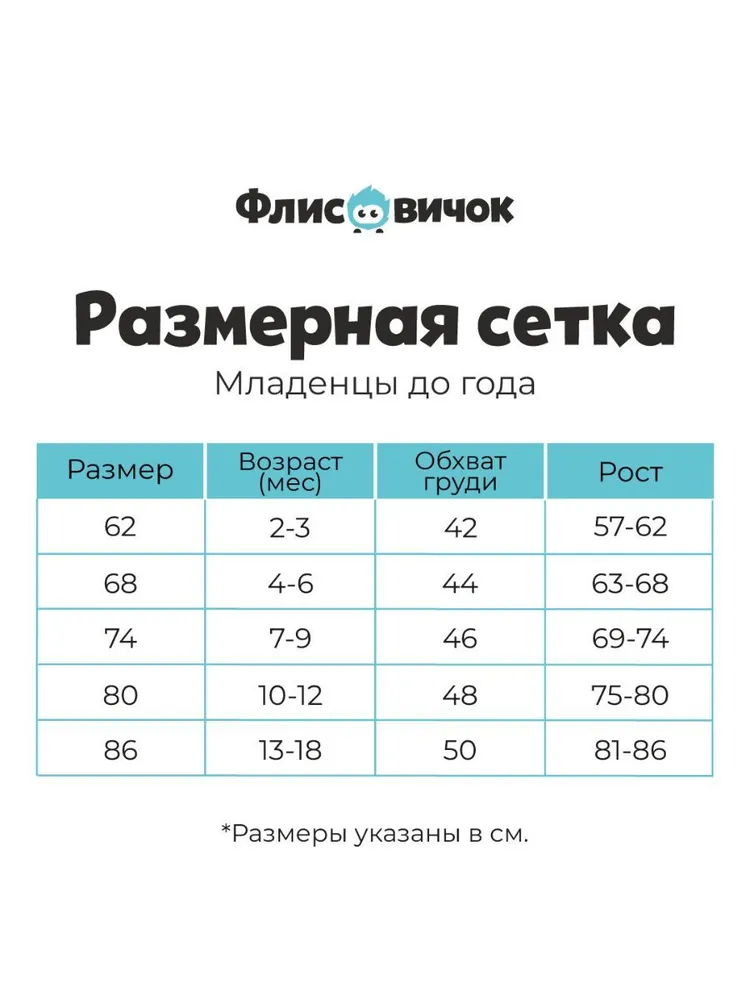 Комбинезон из мягкого флиса комфортен для чувствительной кожи малыша, отлично отводит влагу и сохраняет тепло.