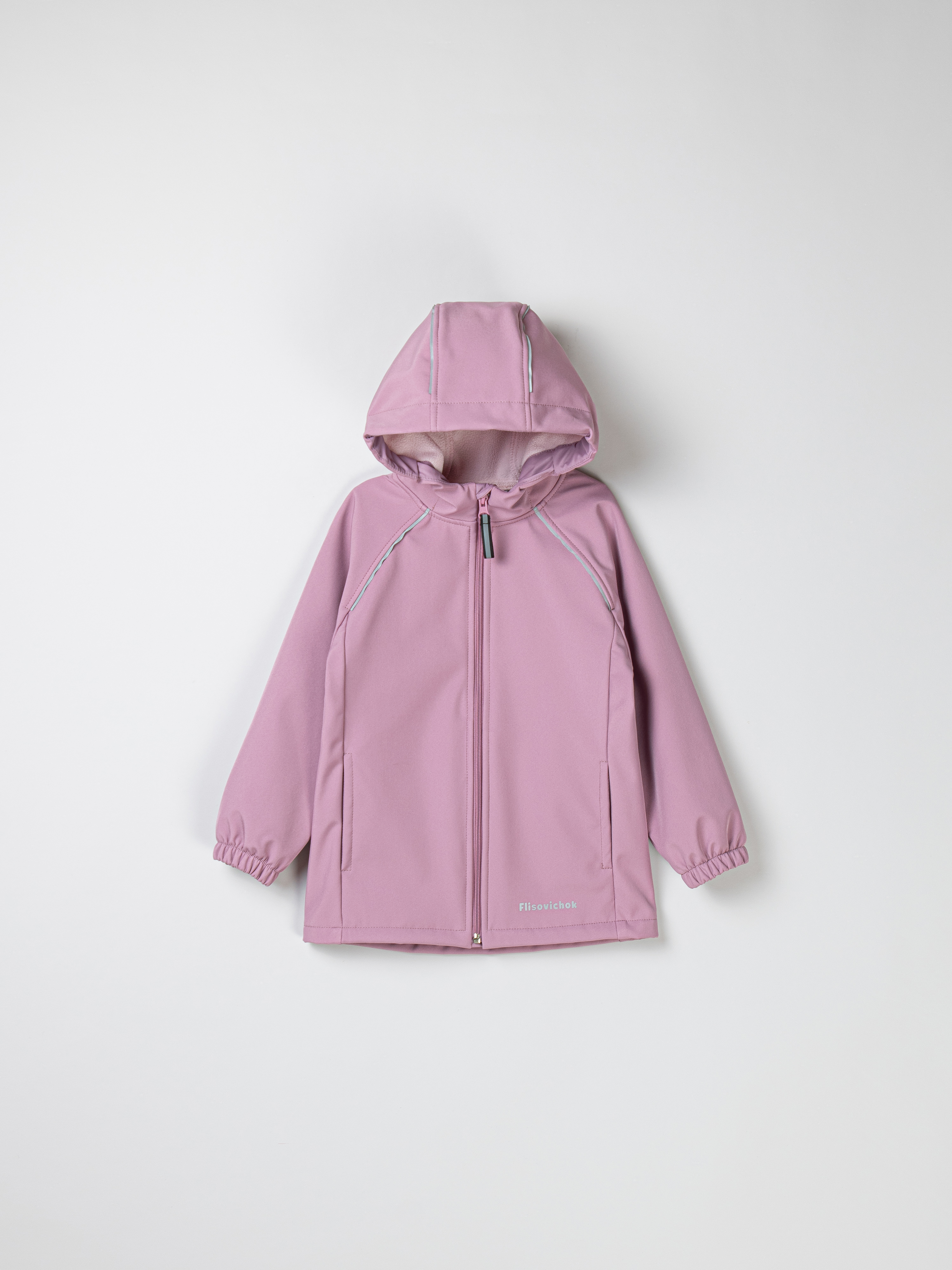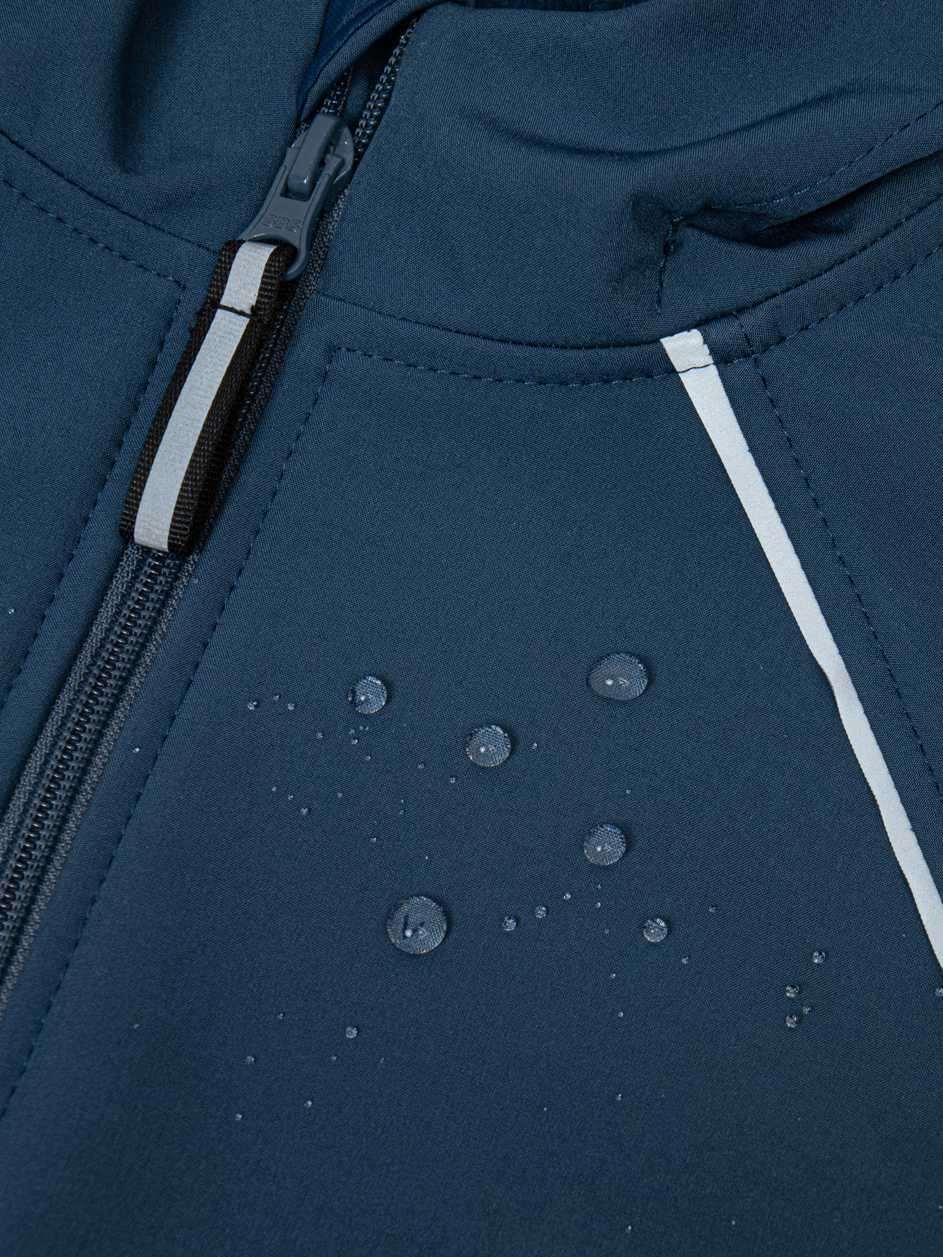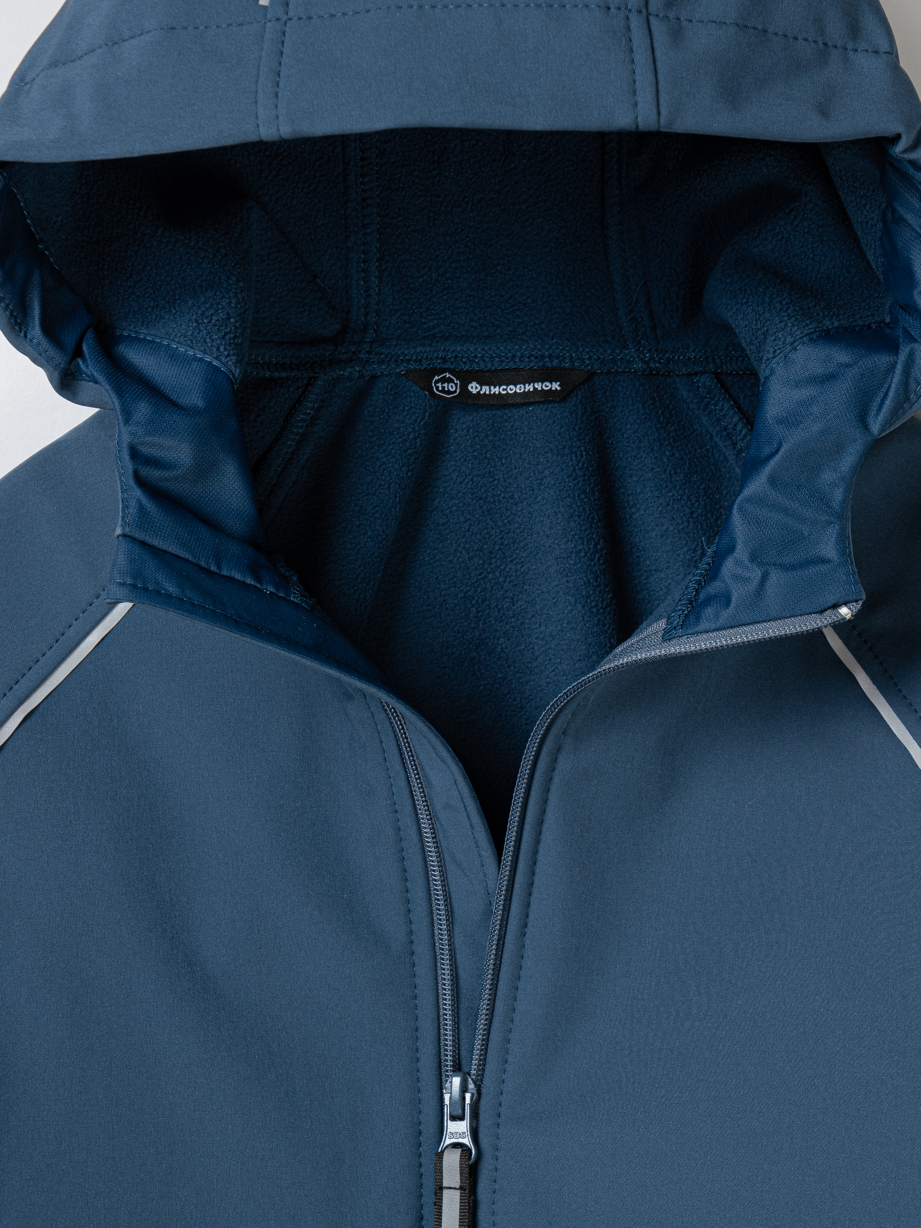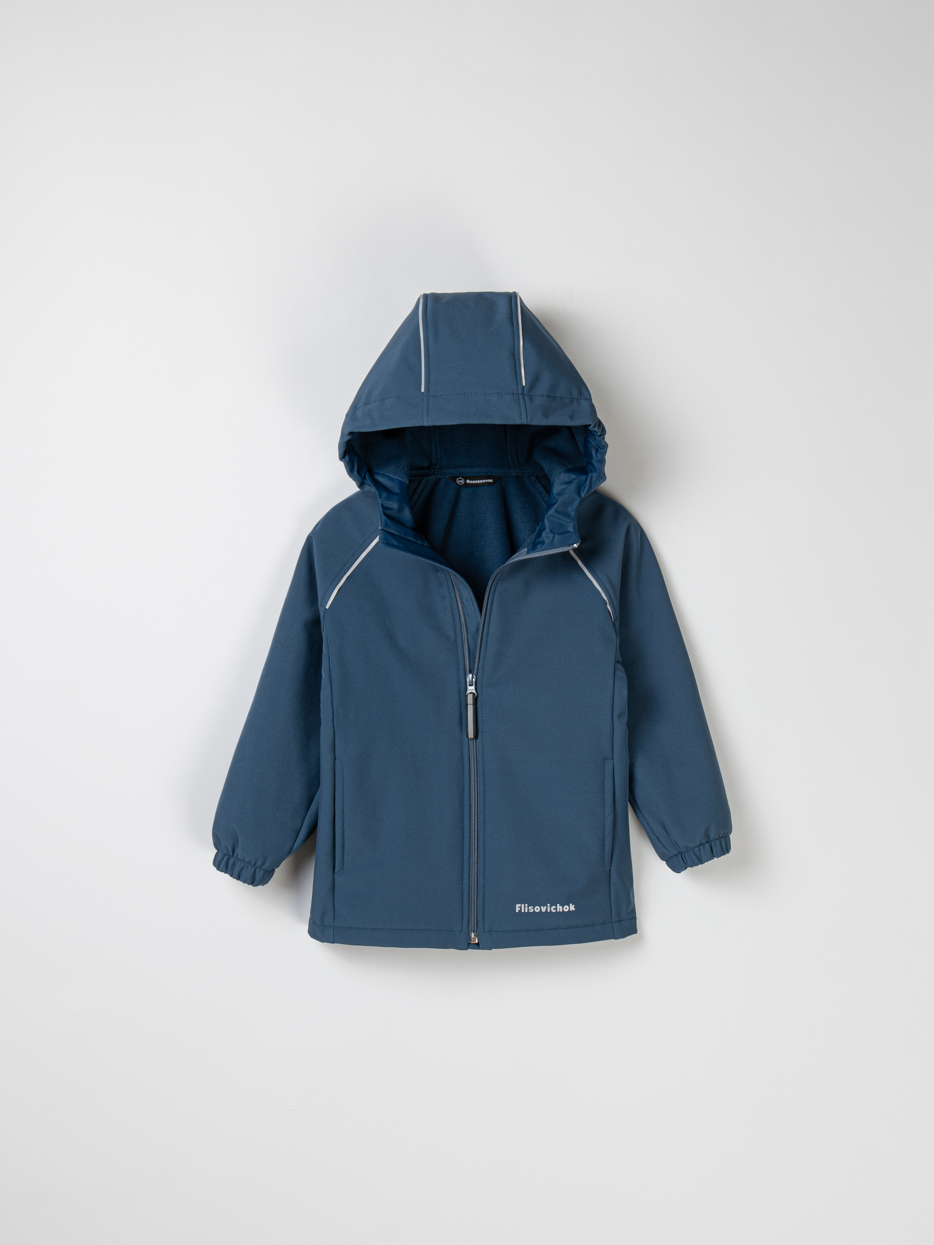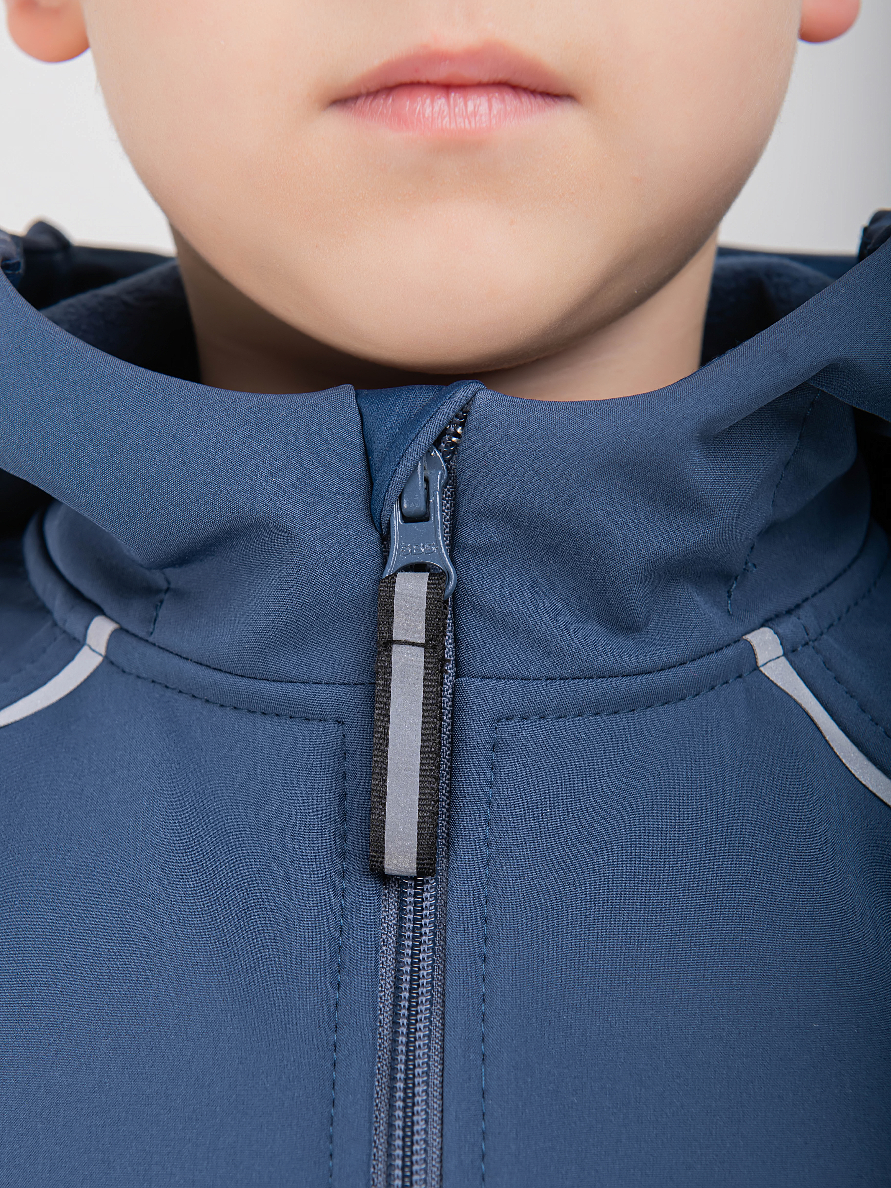 - По изделию расположены светоотражающие элементы: ленты в швах капюшона и рукавов, термонаклейка на полочке и шеврон на спинке.