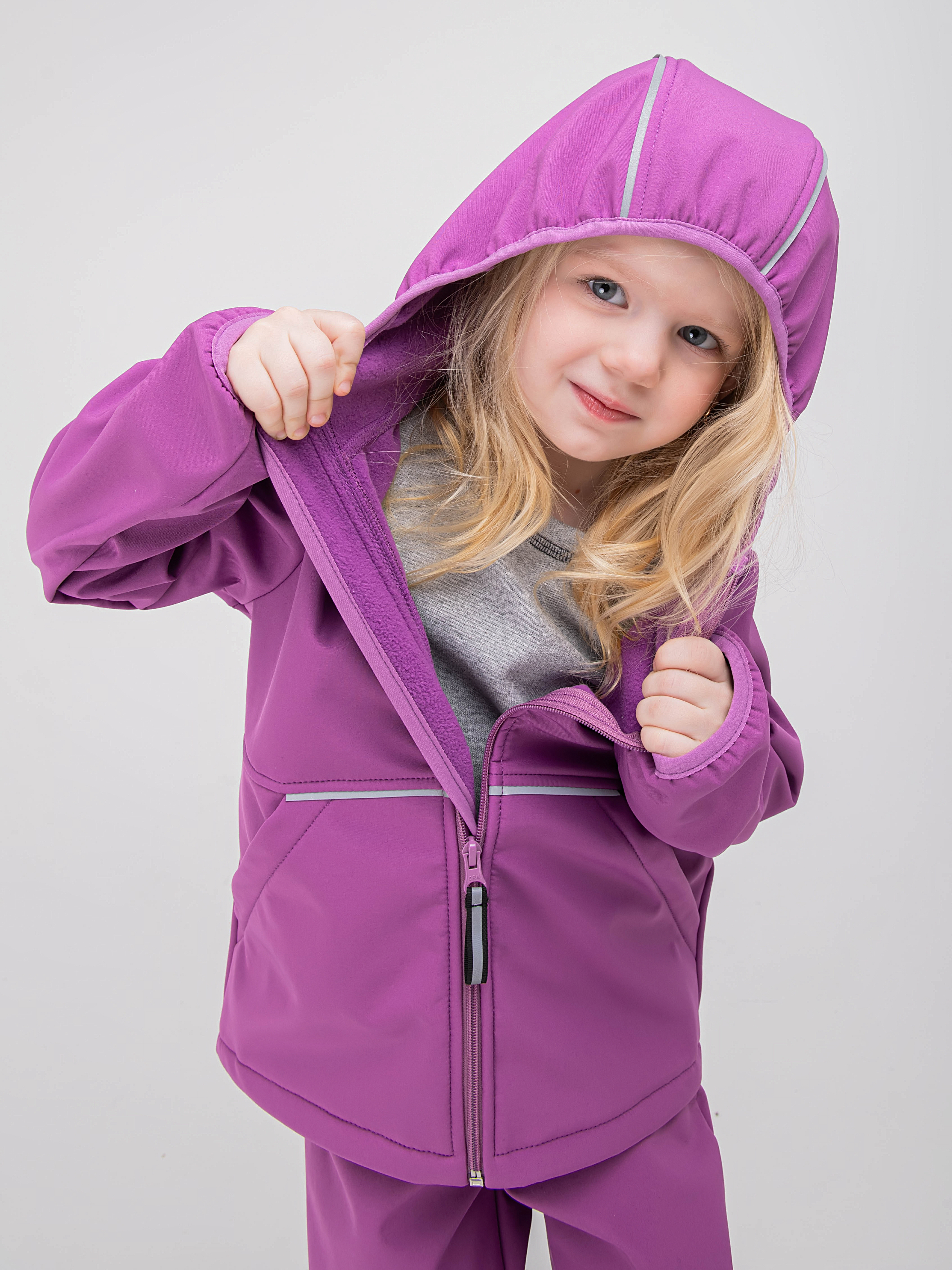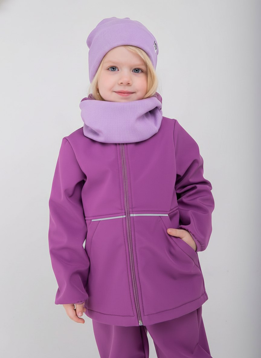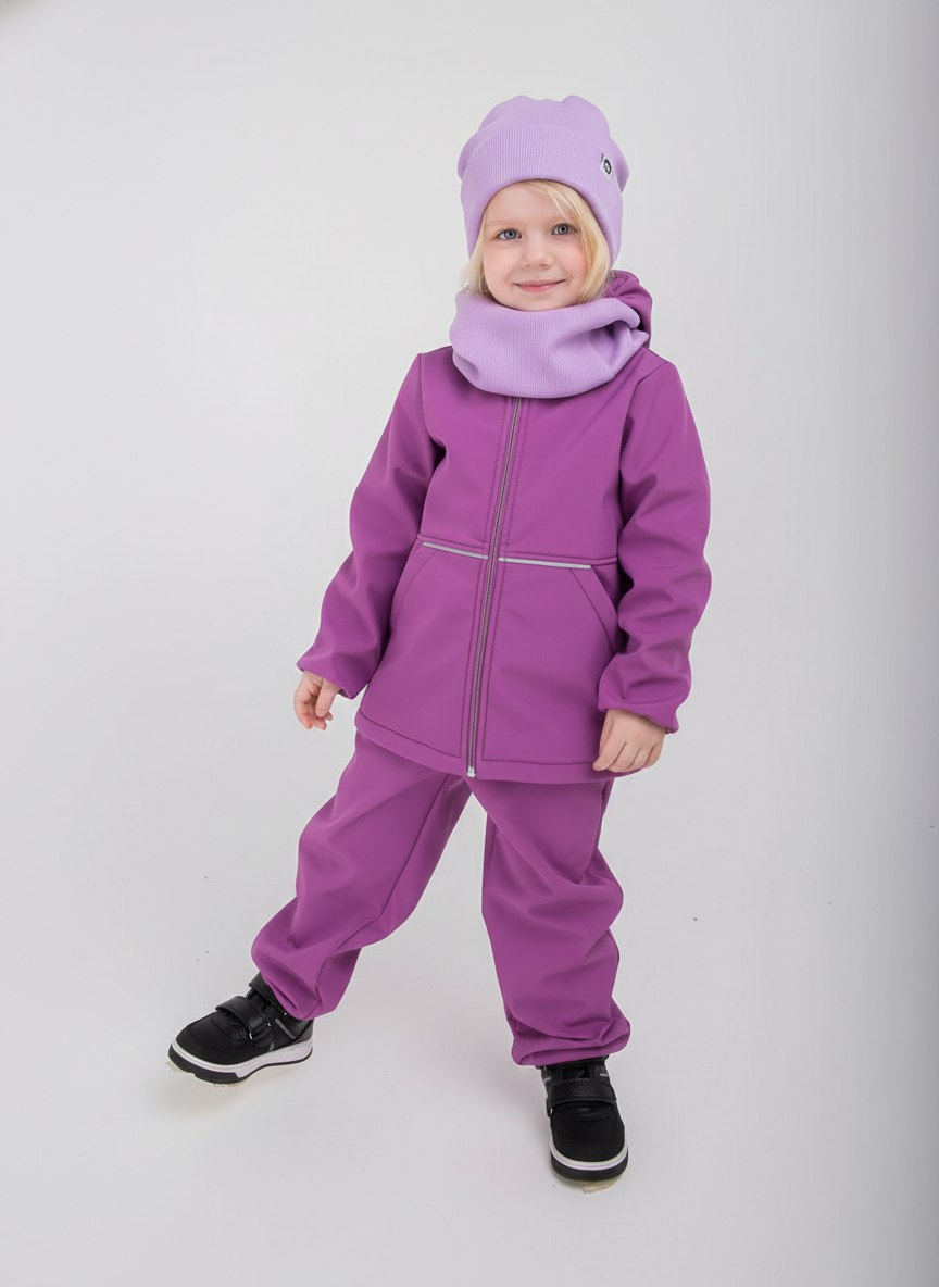 - Уникальный трехслойный мембранный материал софтшелл защищает от брызг и продувания, отводя лишнюю влагу от тела, если ребенок вспотел.