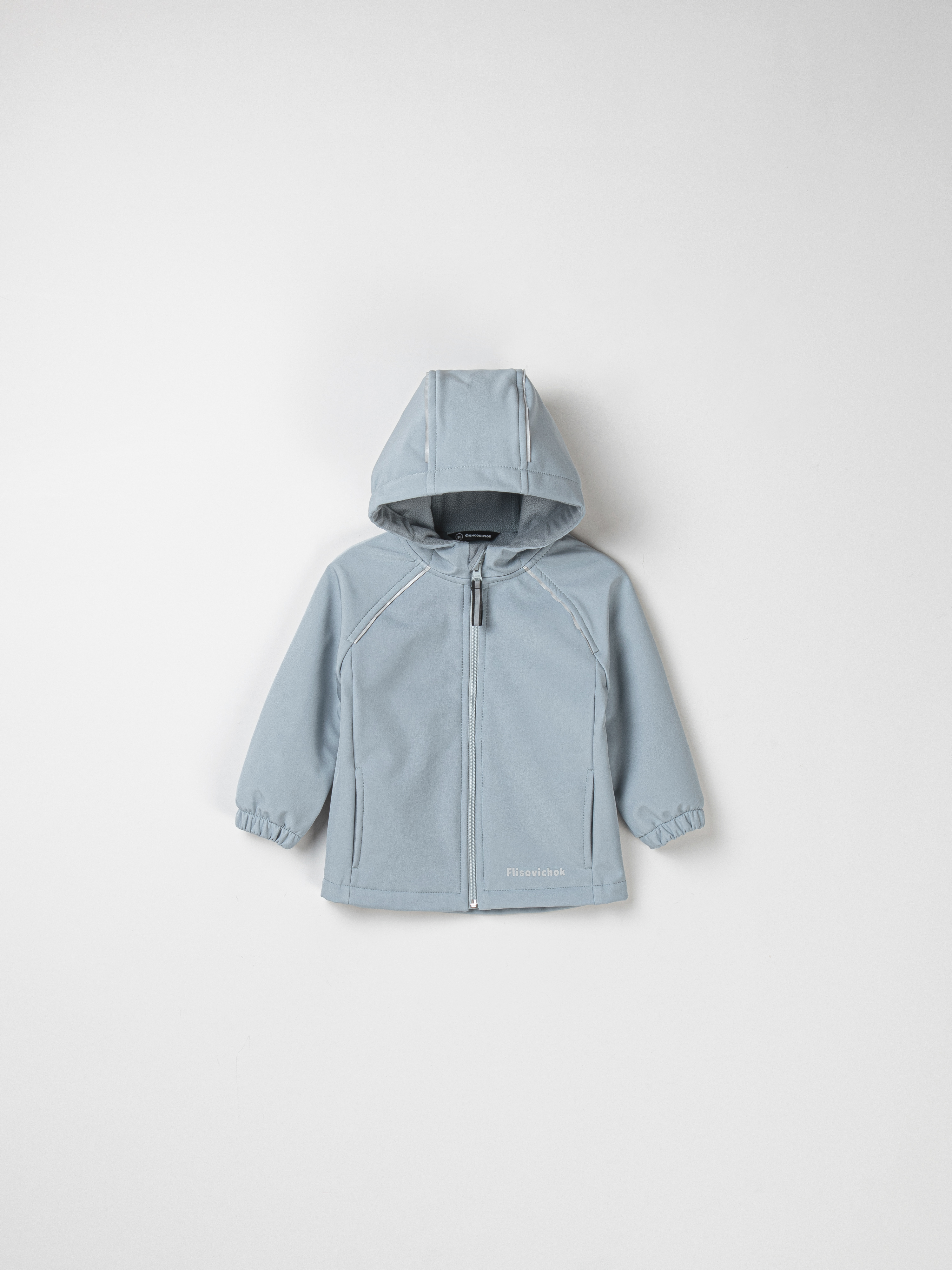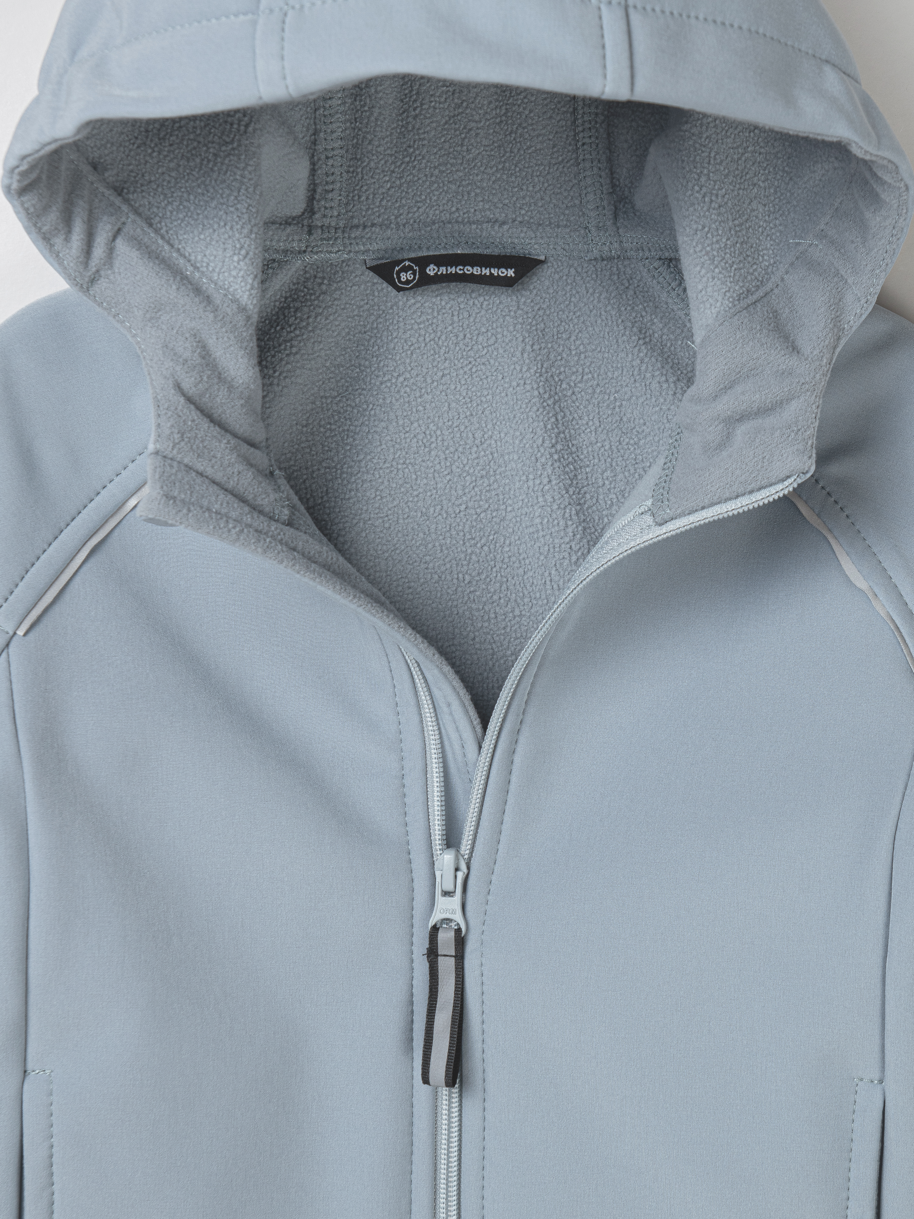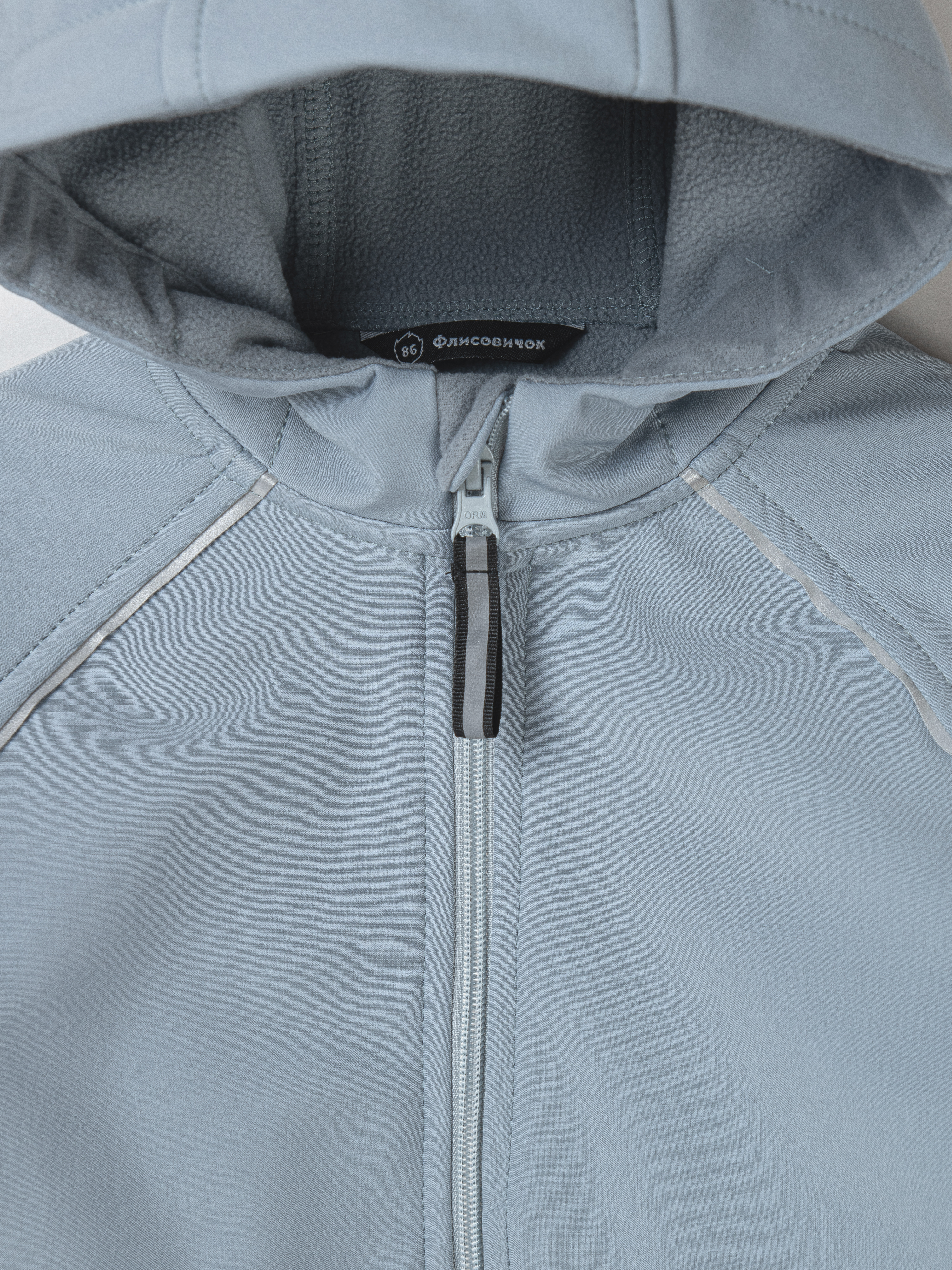 - По изделию расположены светоотражающие элементы: ленты в швах капюшона и рукавов, термонаклейка на полочке и шеврон на спинке.