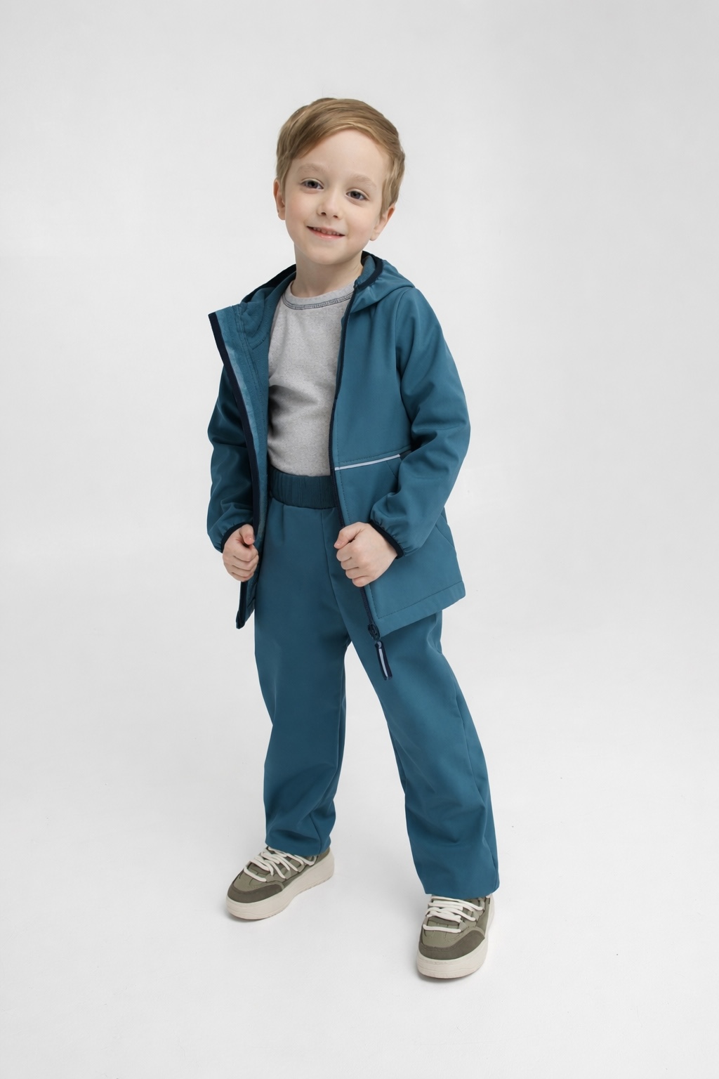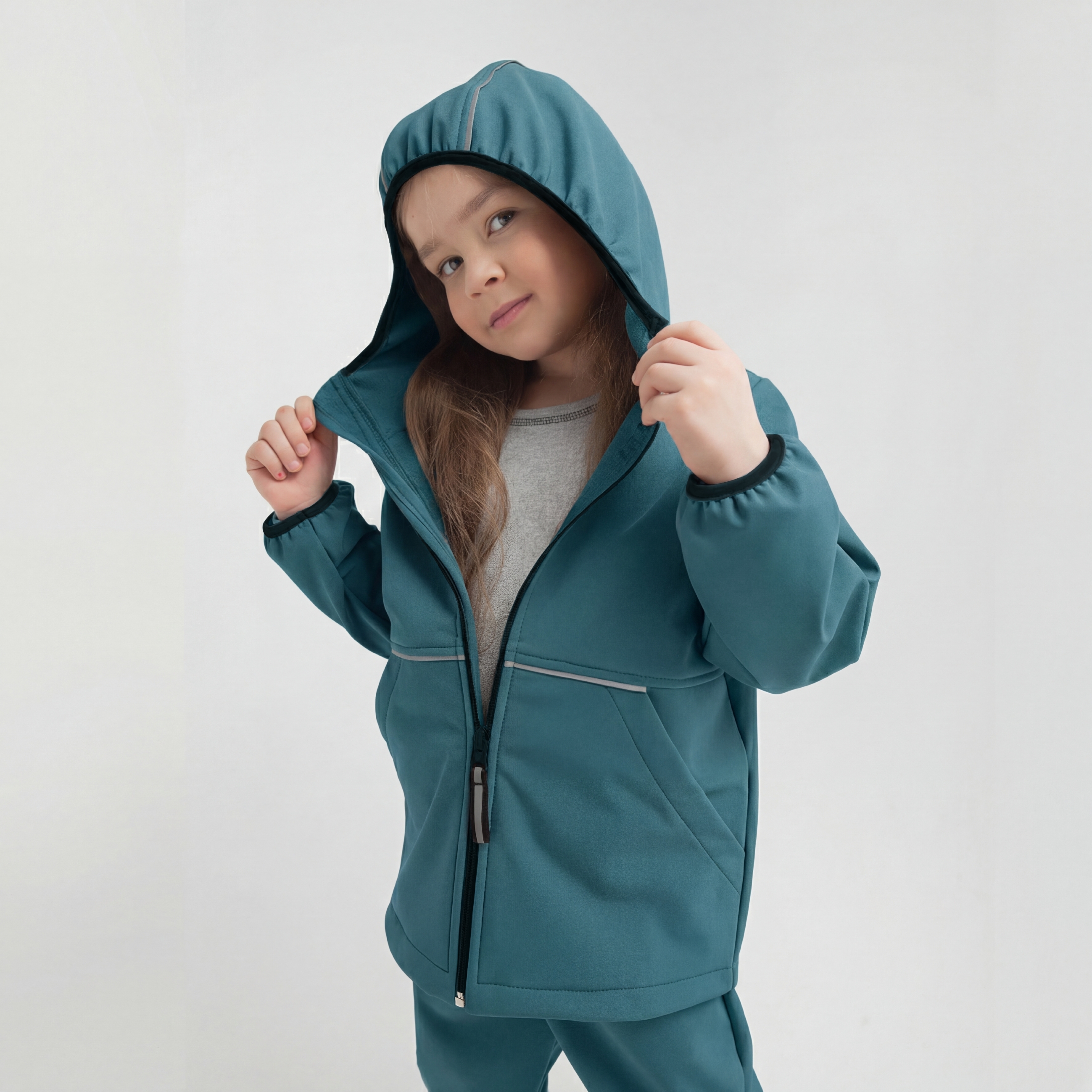 - Уникальный трехслойный мембранный материал софтшелл защищает от брызг и продувания, отводя лишнюю влагу от тела, если ребенок вспотел.